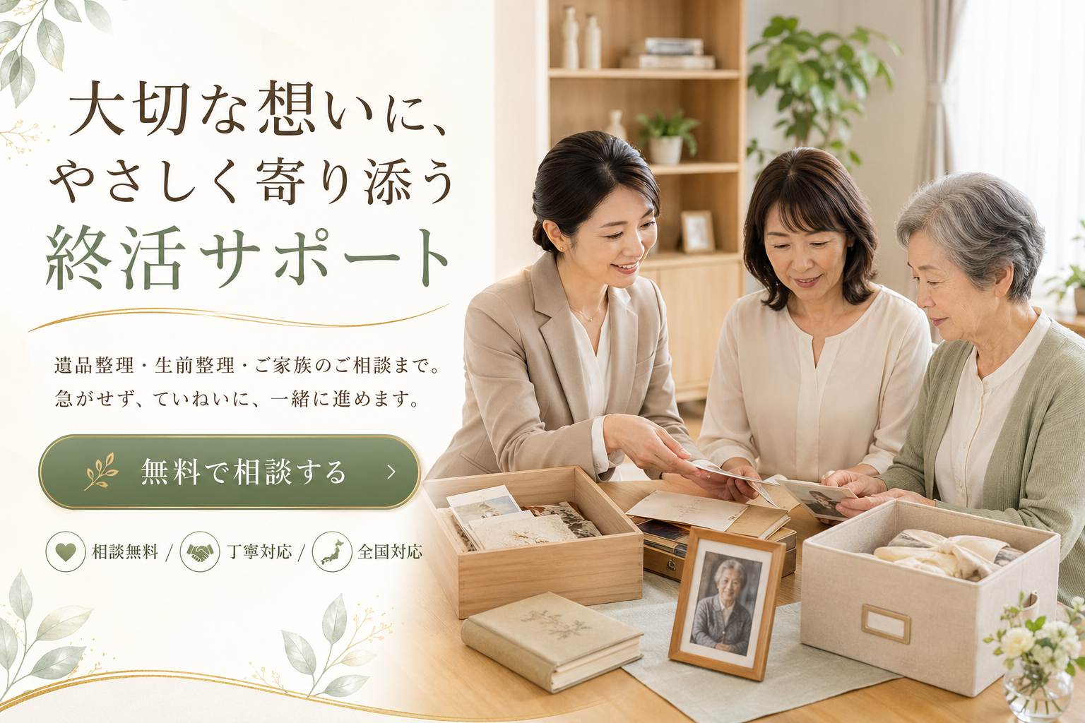 大切な想いにやさしく寄り添う終活サポート、遺品整理・生前整理・ご家族のご相談まで。無料で相談する。